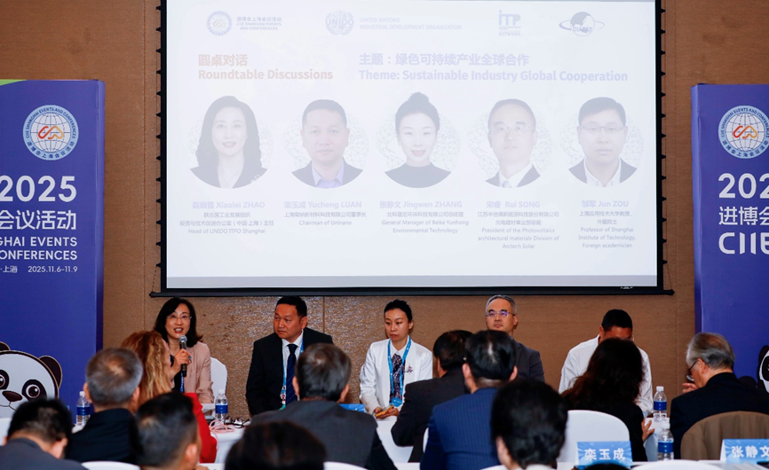 In the roundtable dialogue on "Sustainable Industry Global Cooperation ," moderated by Zhao Xiaolei,Head of UNIDO ITPO Shanghai, Luan Yucheng, Chairman of Shanghai Youna New Materials Technology Co., Ltd., introduced mesoporous materials with "negative cost" emission reduction characteristics, highlighting their significant energy-saving benefits in industrial thermal management. However, he acknowledged the challenges of market "disconnects" and varying policy standards in transitioning from verification to large-scale application. Zhang Jingwen, GM of Beijing Beike Yunhong Environmental Technology Co., Ltd., shared a disruptive technology that converts bulk industrial solid waste into low-carbon/negative-carbon cementitious materials. She emphasized its global promotion potential for the "Chinese solution" worldwide by participating in the development of international standards. Song Rui, Head of Arctech Solar, introduced the integrated model of photovoltaic building materials and its effectiveness in reducing the carbon emissions of buildings throughout their lifecycle. He noted that while Chinese photovoltaic technology leads globally, international recognition still needs improvement, and the company is addressing challenges in different markets through global blueprint and localized operations. Zou Jun, Professor at Shanghai Institute of Technology proposed that optical chips and integrated modules are core drivers of smart agriculture. He emphasized the need for context-specific technology implementation and called for international collaboration to advance technological integration and application innovation.